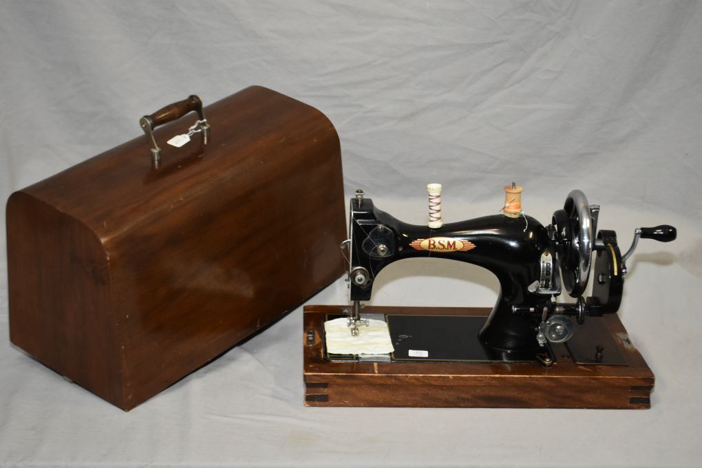 Antique Portable Walnut Cased Hand Crank B S M Sewing Machine